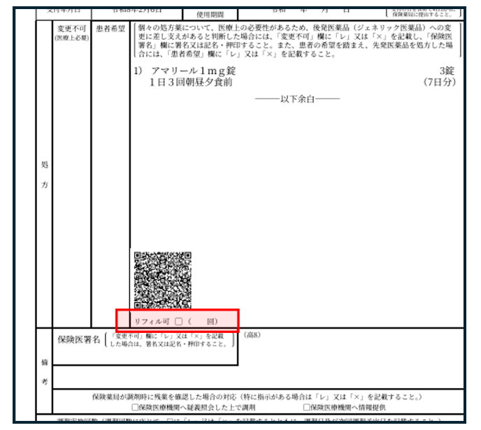 ・「リフィル可」のチェック ・リフィル回数の記載