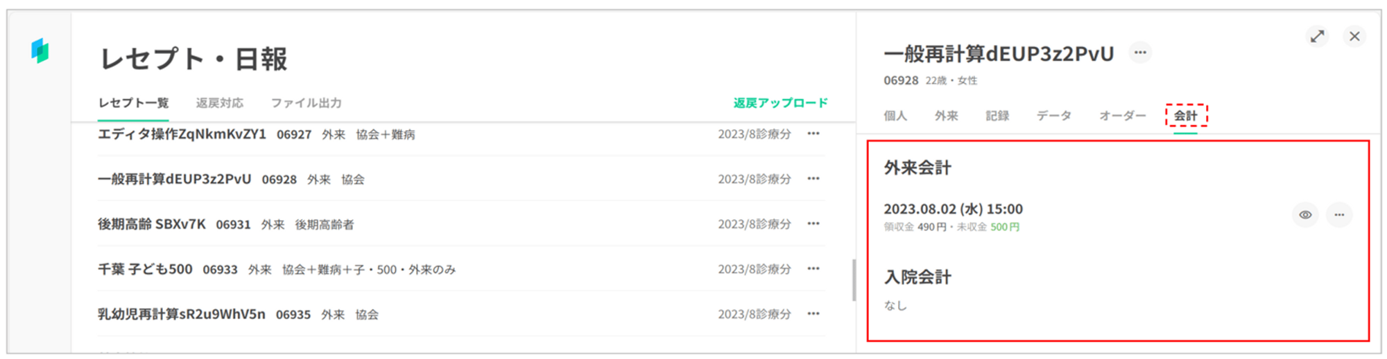 【会計を確認】・・・レセプト一覧画面右側に対象患者様の会計情報が表示されます
