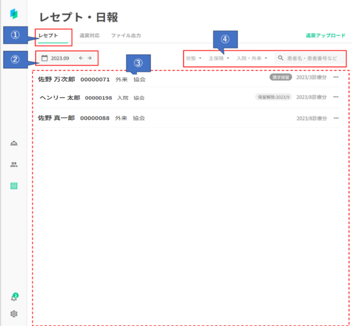 ①「レセプト一覧」タブ・・・レセプト一覧画面を表示するタブです。