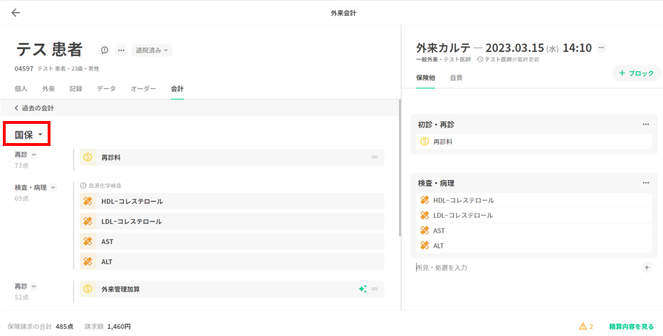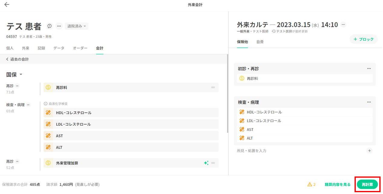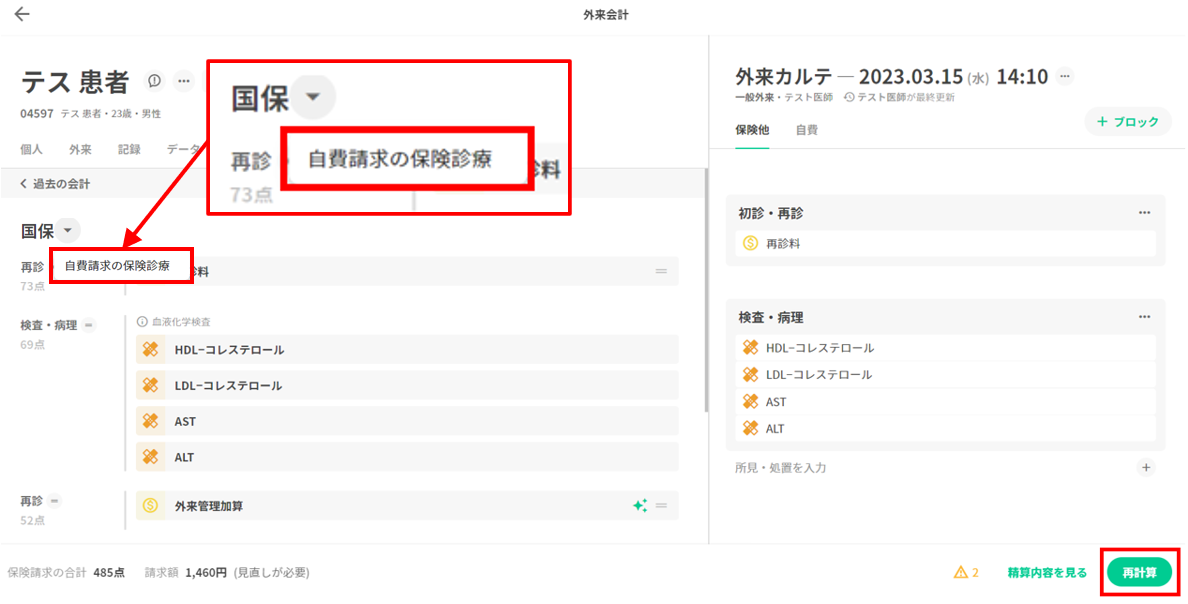 (3)3/15の会計を開き、保険を「国保」から「自費請求の保険診療」に変更し、「再計算」を押します。