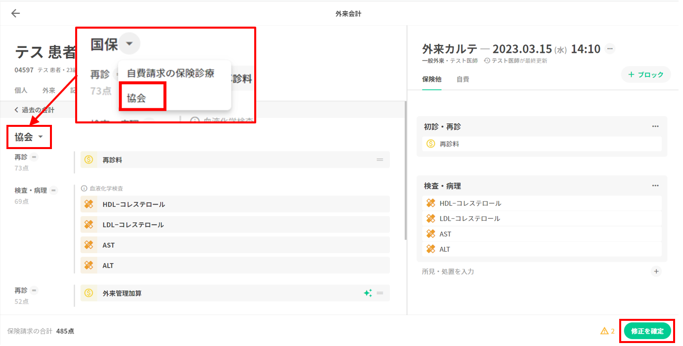(3)3/15の会計を開き、保険を「国保」から「協会」に変更し、「修正を確定」を押します。