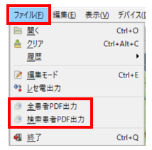 ファイルから全患者PDF出力 または 検索患者PDF出力を選択します。