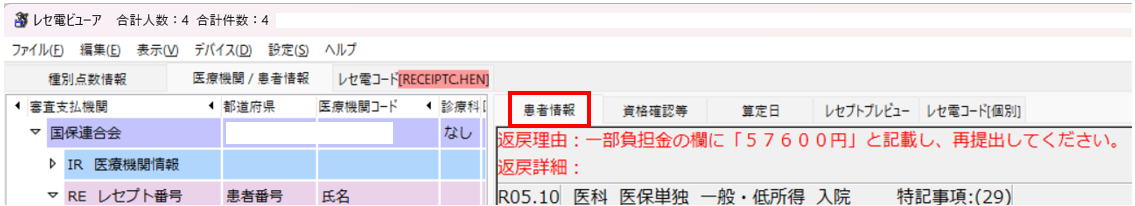 返戻ファイル「RECEIPTC.HEN」を開いた場合、患者情報から返戻理由を参照できます。