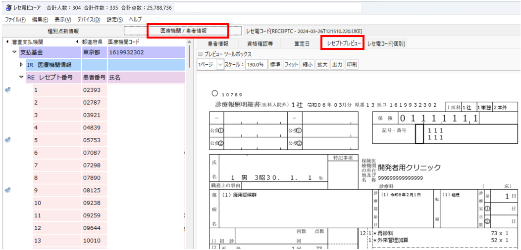 「医療機関/患者情報」から「レセプトプレビュー」を開きます。