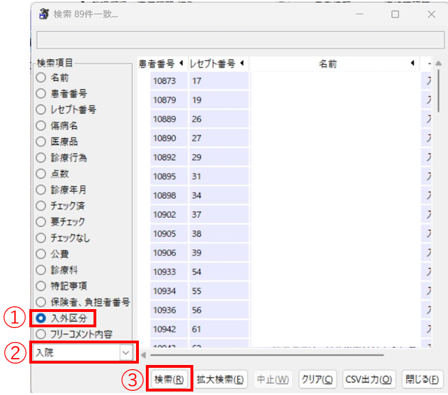 例)入外区分検索 以下の順で検索します。 ①検索項目から入外区分を選択 ②入院/入院外を選択 ③検索を押下
