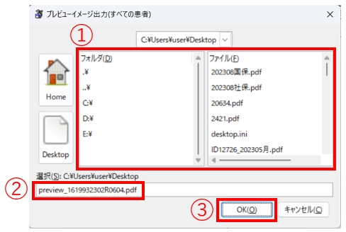 2. ①保存先、②PDFファイル名を入力後、③「OK」を押下します。
