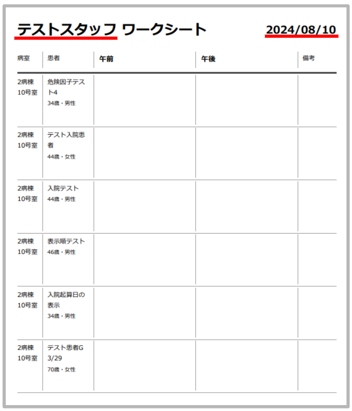印刷されるワークシートのタイトルは「(印刷したユーザー名)ワークシート」となります。また、ワークシート右上には記録日が表示されます。