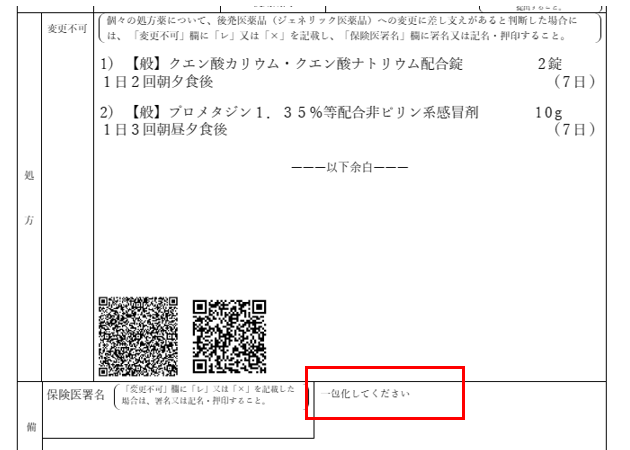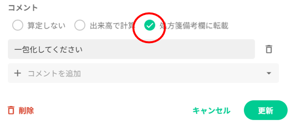 「外来カルテ」画面で、処方する医薬品のうち、どれか一つの医薬品を開いて「コメント」の”処方箋備考欄に記載”とし、コメントをフリーコメントで入力