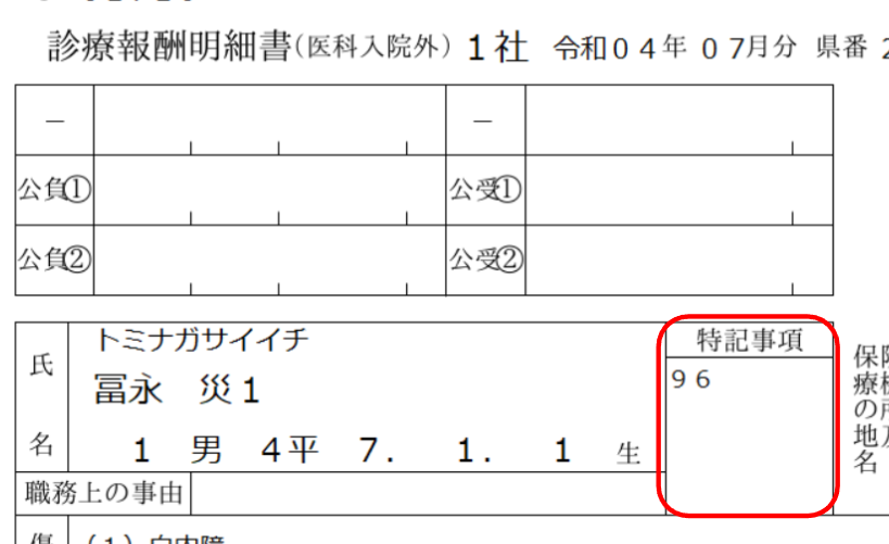 ①減免が設定されている期間中のレセプトには特記事項に「96(災1)」が出力されます。