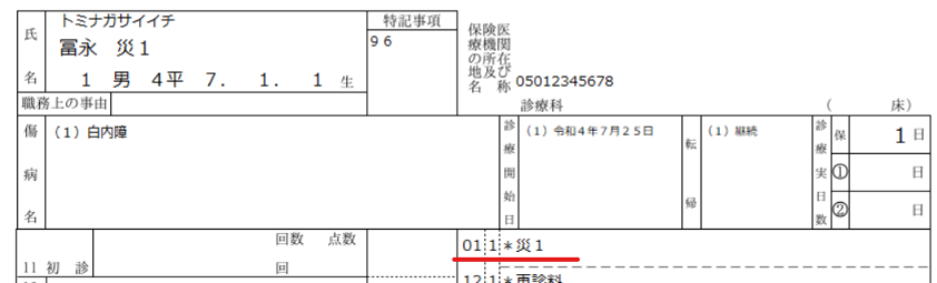 ②「災1」のフリーコメントが診療区分01で出力され、適用欄の先頭に記載されます。