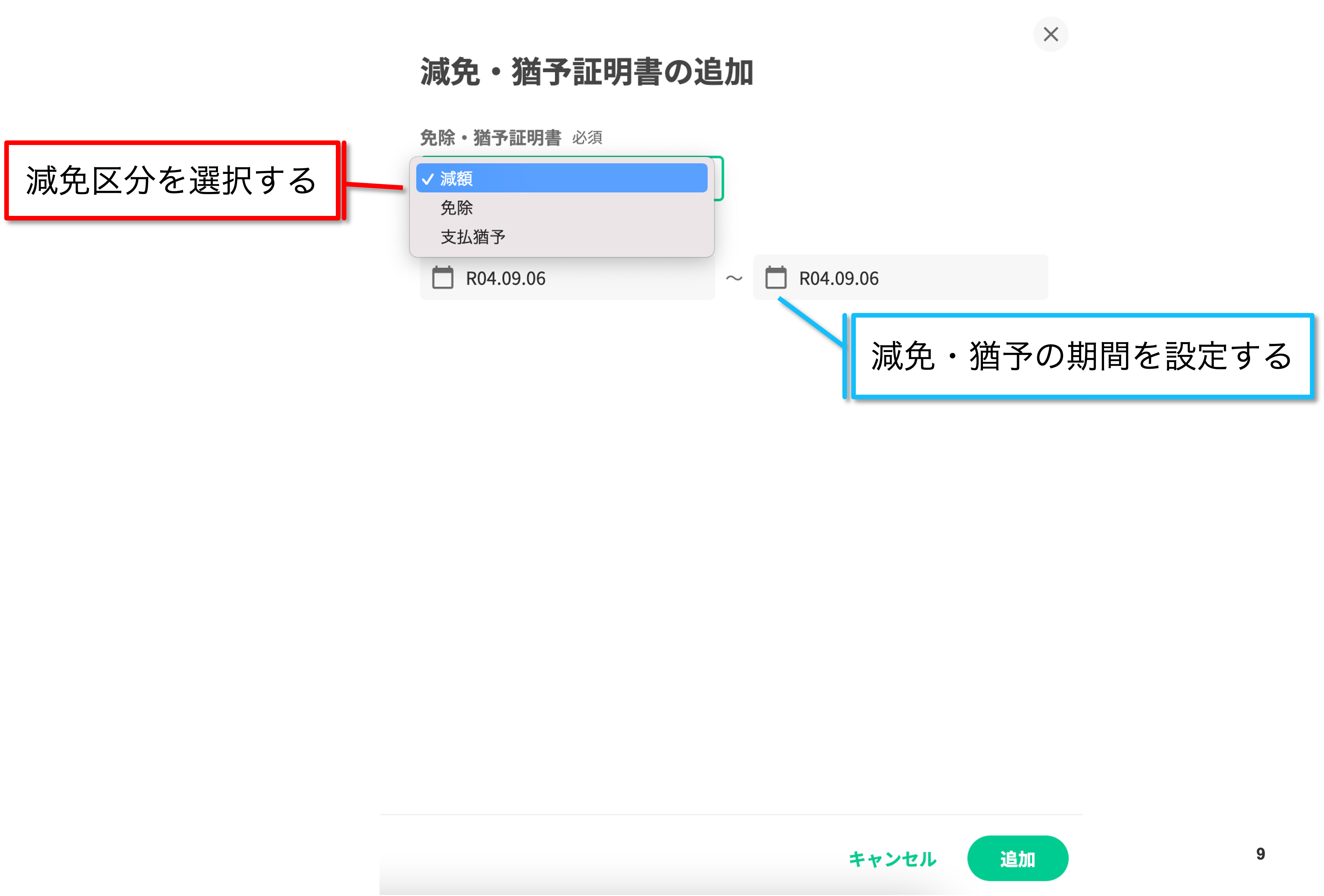 ③減免区分(減額・免除・支払猶予)より該当の項目を選択し、任意の期間を登録します。