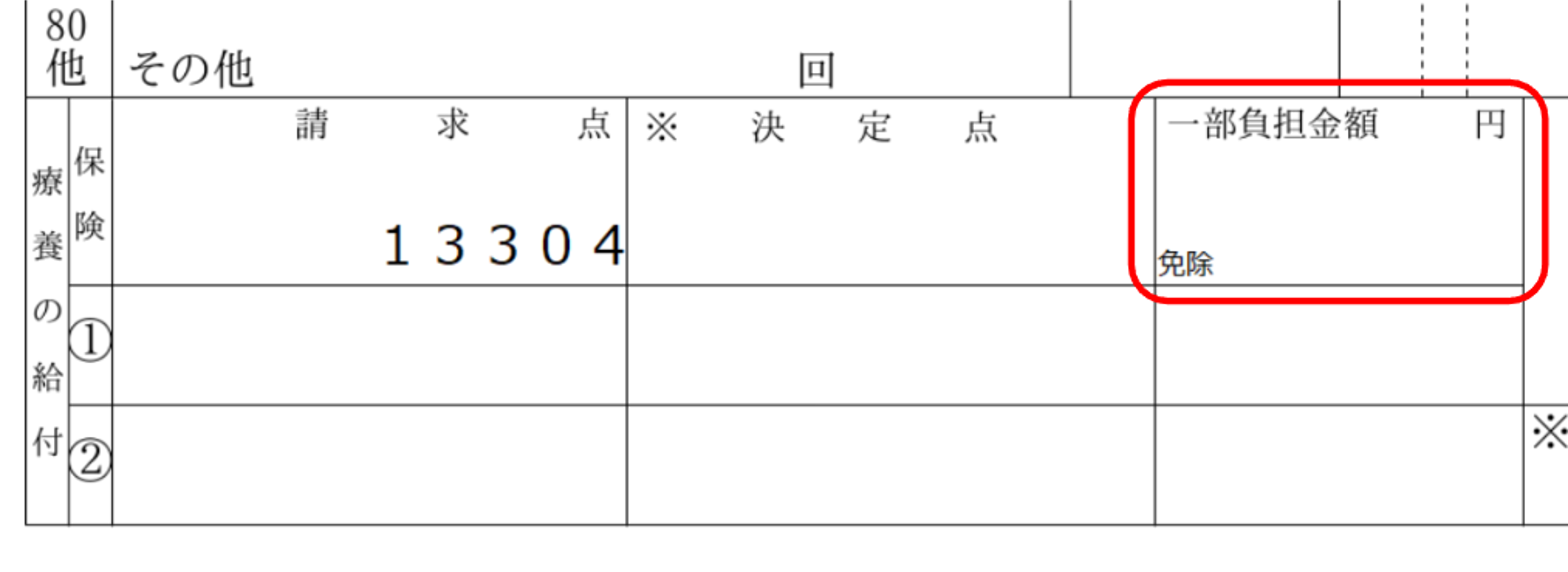 ③療養の給付欄、保険の行の一部負担金額欄は空欄となり、減免区分が出力されます。