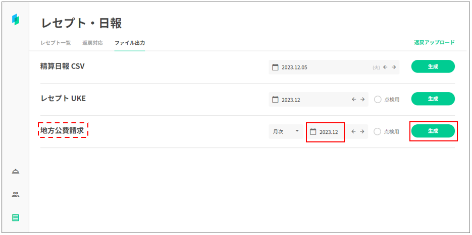 2.地方公費請求のカレンダー欄で提出年月を指定し、生成ボタンを押下します。