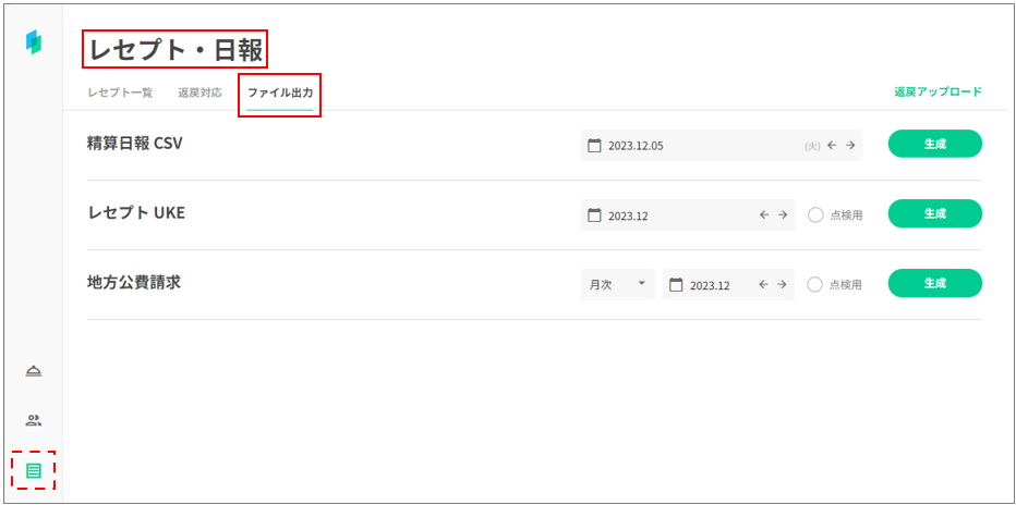 1.レセプト・日報画面の「ファイル出力」タブを選択します。