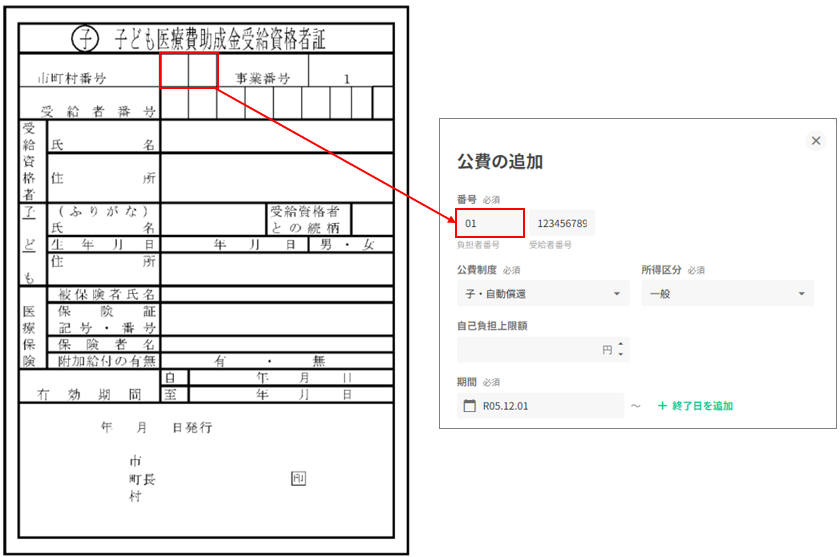 受給者証の「市町村番号」欄に記載されている2桁の番号を公費負担者番号欄に2桁で登録してください。