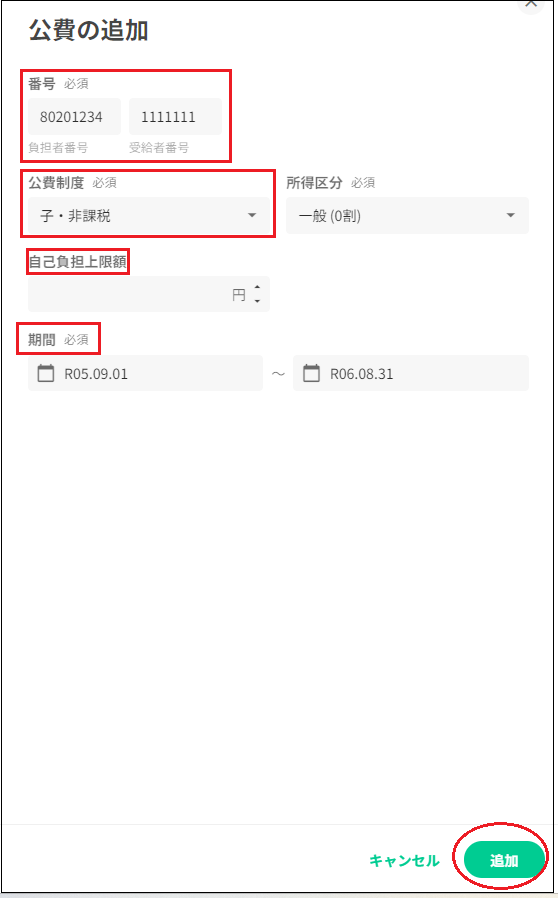 公費の追加 1. 患者様の受給者証の番号を登録します 2. 「公費制度」欄に「子・非課税」と表示されることを確認します 3. 「自己負担上限額」欄は金額の記載不要です 4. 「期間」の欄に受給者証の有効期間を登録します 5. 受給者証の登録が終了しましたら、右下の「追加」マークをクリックし てください 6. 以上で公費の追加は終了です