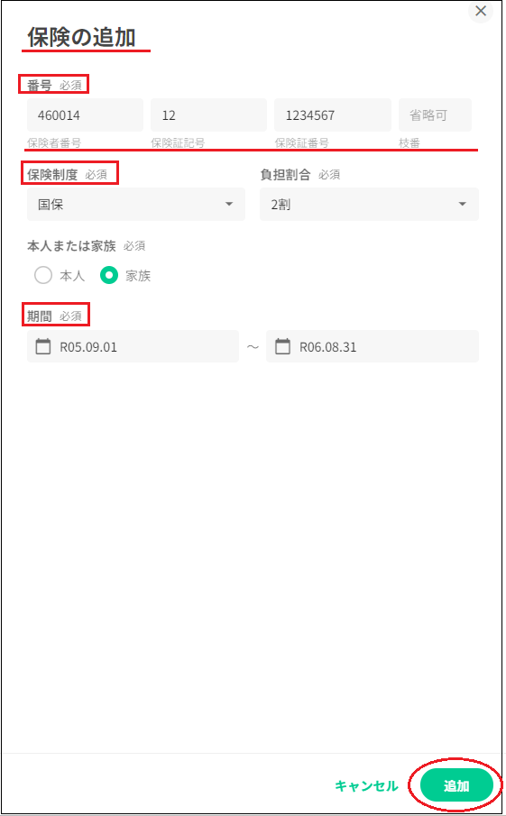 1. 患者様持参の保険証の登録を行います 2. 右下の「追加」をクリックしてください 3. これで保険証の登録は終了です
