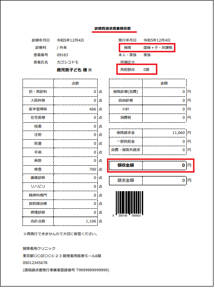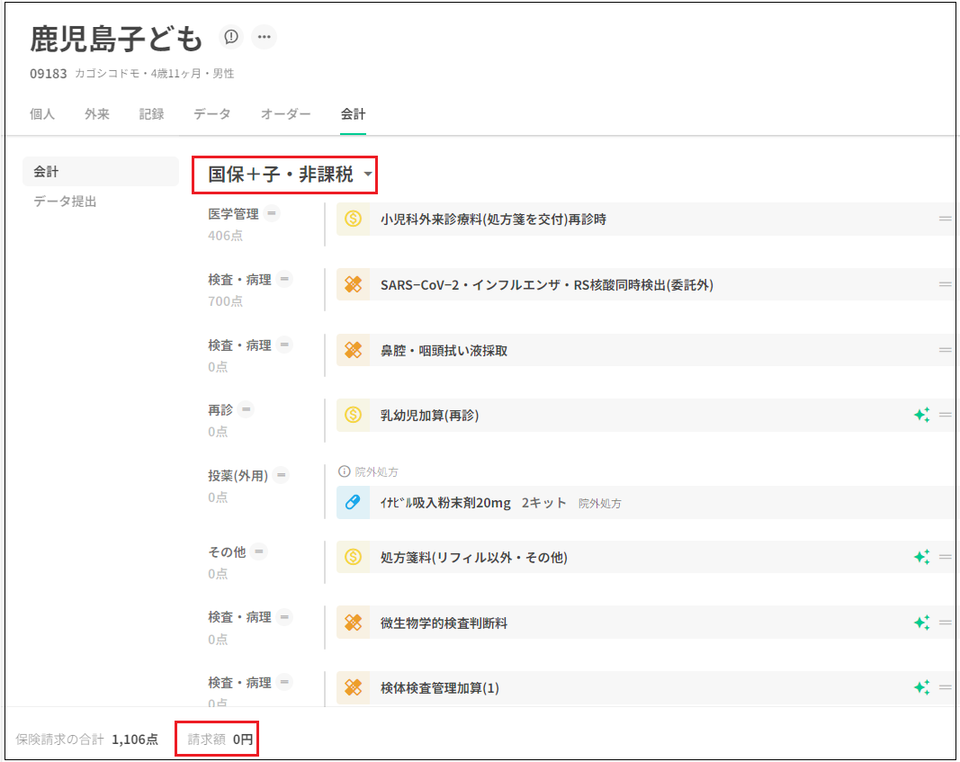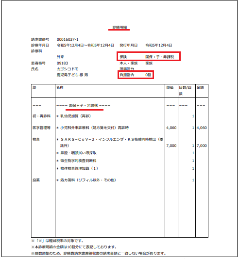・診療明細上でも、選択した保険と公費「子・非課税」が記載されていることが確認できます