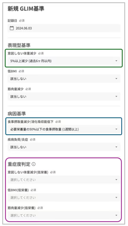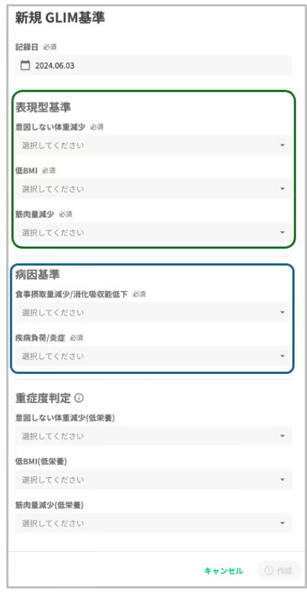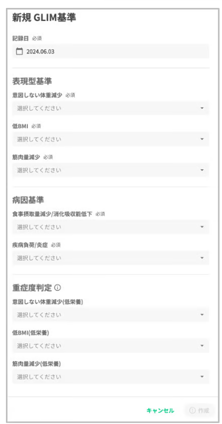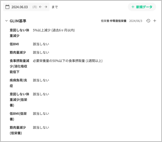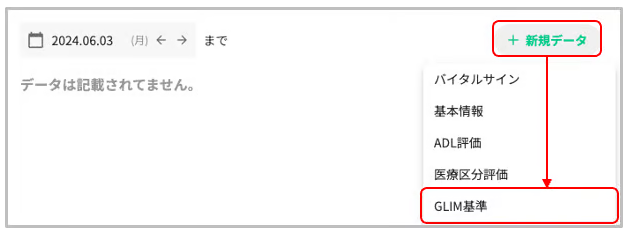 データタブの「新規データ」から「GLIM基準」を選択することで入力画面が表示される