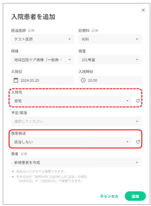 地域包括ケア病棟の在宅患者支援病床初期加算について、救急搬送患者の緊急入院を受け入れることによる負担等を考慮した評価体系に見直されたことにより在宅患者支援病床初期加算が分岐したため、地域包括ケア対象に入棟・入室する際、救急搬送か否かを選択できるように対応いたしました。