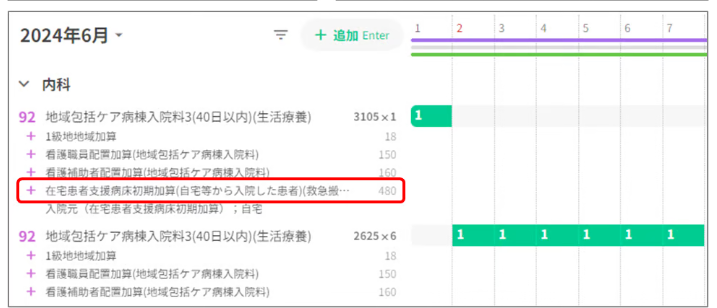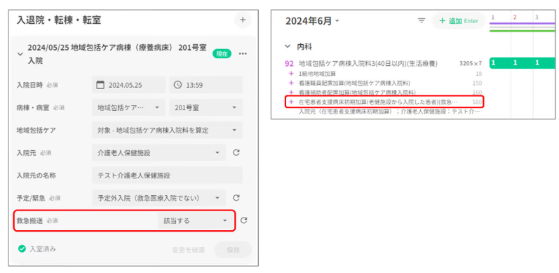 救急搬送に「該当する」と登録されている場合は「在宅患者支援病床初期加算(老健施設から入院した患者)(救急搬送)」または「在宅患者支援病床初期加算(自宅等から入院した患者)(救急搬送)」を、「該当しない」と登録されている場合は「在宅患者支援病床初期加算(介護老人保健施設から入院した患者)(1以外)」または「在宅患者支援病床初期加算(自宅等から入院した患者)(1以外)」の診療行為を、地域包括ケア病棟入院料と同算定単位内に自動算定します