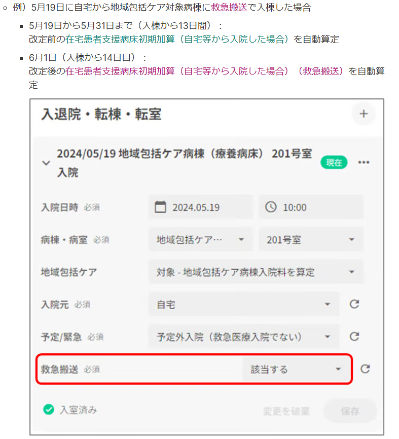 「【令和6年度改定】[2024/05/20]【入院】地域包括ケアの在宅患者支援病床初期加算における救急搬送の有無に対応いたしました!!」でご案内いたしました、入院時の救急搬送に「該当する」「該当しない」の登録内容に従って、在宅患者支援病床初期加算の自動算定を行うように対応いたしました