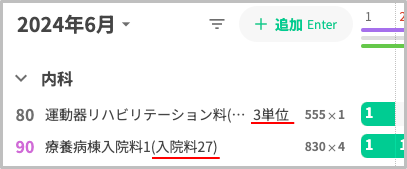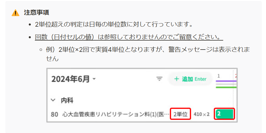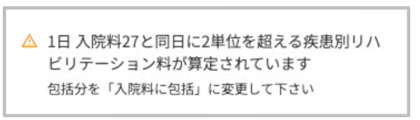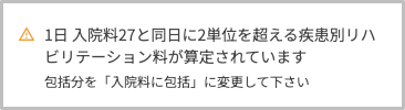 コストカレンダー(以下、コスカレ)において、療養病棟入院料27と同日に疾患別リハビリテーション料が2単位を超えて算定されている場合、算定単位の分割を促すエラーメッセージを表示いたします