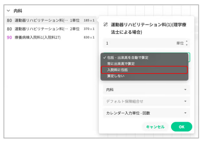 エラーパネルのメッセージに沿って算定単位を分割いただいた上で、包括扱いする疾患別リハビリテーション料について「入院料に包括」の指定をお願いいたします