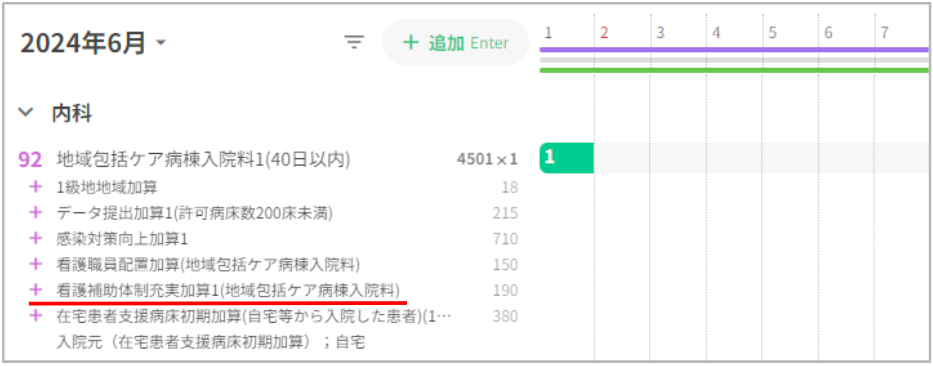 看護補助体制充実加算の自動算定には設定が必要です。 別途、各医療機関様ごとに2024年6月1以降の施設基準届出状況をヒアリングさせていただいておりますので、ヒアリング結果を元に弊社にて設定を行います。 なお、設定後の自動算定動作は2024年6月1日以降に医療機関様でご確認いただけます。
