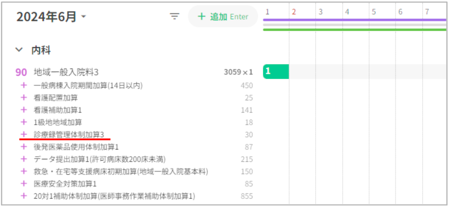 施設基準を満たす病棟に入院している場合、入院料と同一算定単位内に初日に限り「診療録管理体制加算」を自動算定いたします。