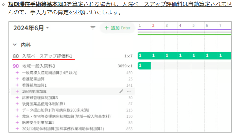 入院ベースアップ評価料の自動算定には設定が必要です。 別途、各医療機関様ごとに2024年6月1以降の施設基準届出状況をヒアリングさせていただいておりますので、ヒアリング結果を元に弊社にて設定を行います。