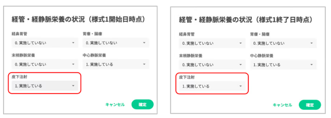 ・「経管・経静脈栄養の状況(様式1開始日時点)」「経管・経静脈栄養の状況(様式1終了日時点)」について、「皮下注射」の項目を追加