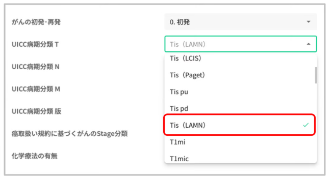 「UICC病期分類 T」の選択肢に「Tis(LAN)」を追加