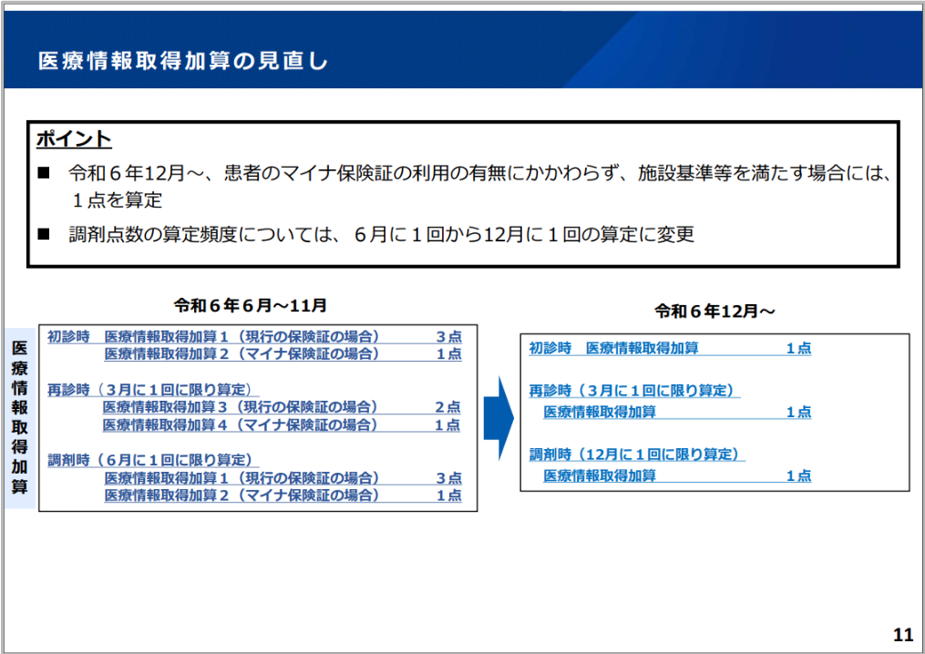 ご案内文書に記載されている画面情報は、医療機関様で表示が異なる場合があります。 予めご了承いただきますようお願いいたします。1.令和6年10月以降の医療情報取得加算の見直しについて令和6年12月からマイナ保険証利用の有無にかかわらず、医療情報取得加算は1点の算定に変更されます。【参考】医療DX推進体制整備加算・医療情報取得加算の見直しについて令和6年8月20日付け厚生労働省保医発0820第1号「医療情報取得加算及び医療DX推進体制整備加算の取扱いについて」