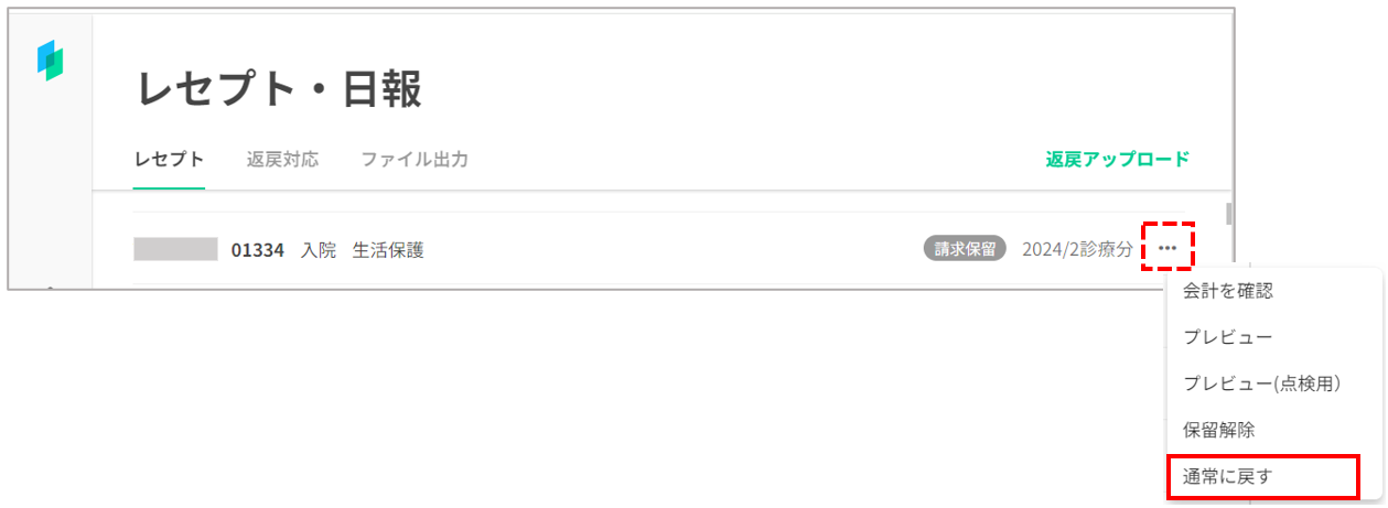レセプトデータの「…」を押下し、「通常に戻す」を選択します。