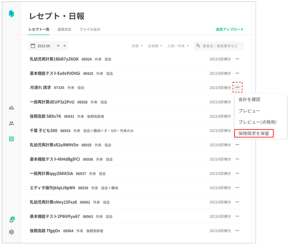 2.保留としたいレセプトデータの「…」を押下し、「保険請求を保留」を選択します。