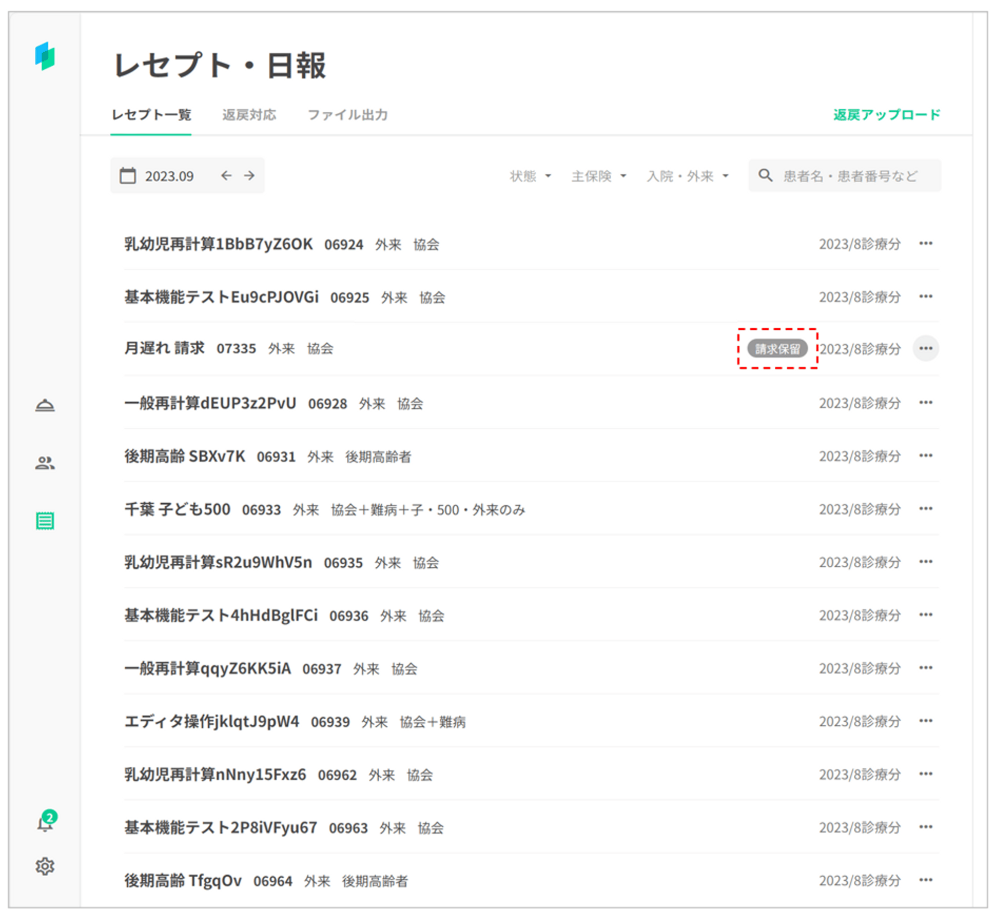 3.「保険請求を保留」としたレセプトデータに「請求保留」と表示されます。