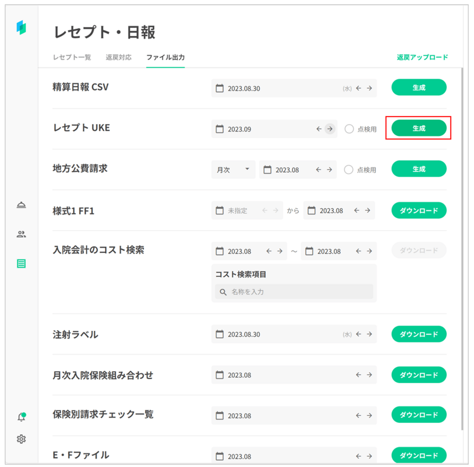 請求年月を指定し、レセプトUKEの「生成」を行います。