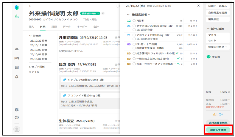 外来:【確定して請求】→【請求を確定(又は変更を確定)】を押下