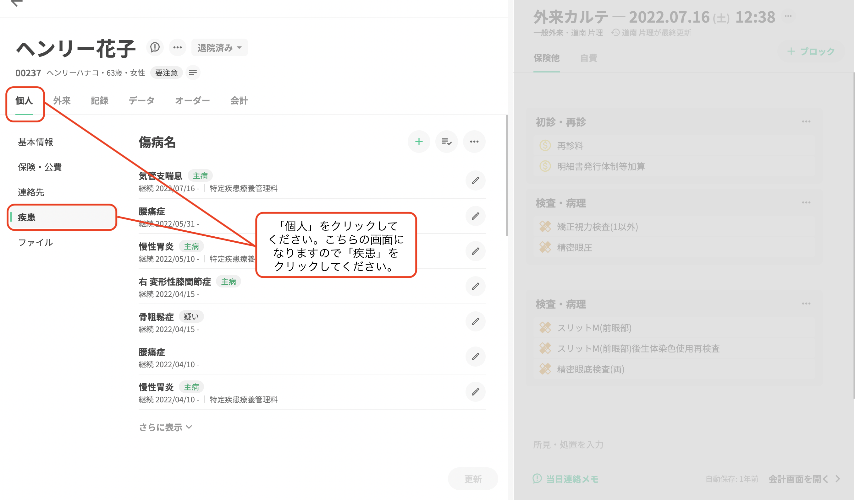 ①「外来カルテ画面」を開きます。 ②カルテ画面左側に「傷病名」を表示させます。 ③「傷病名」と「外来カルテ」が同時に確認できます。
