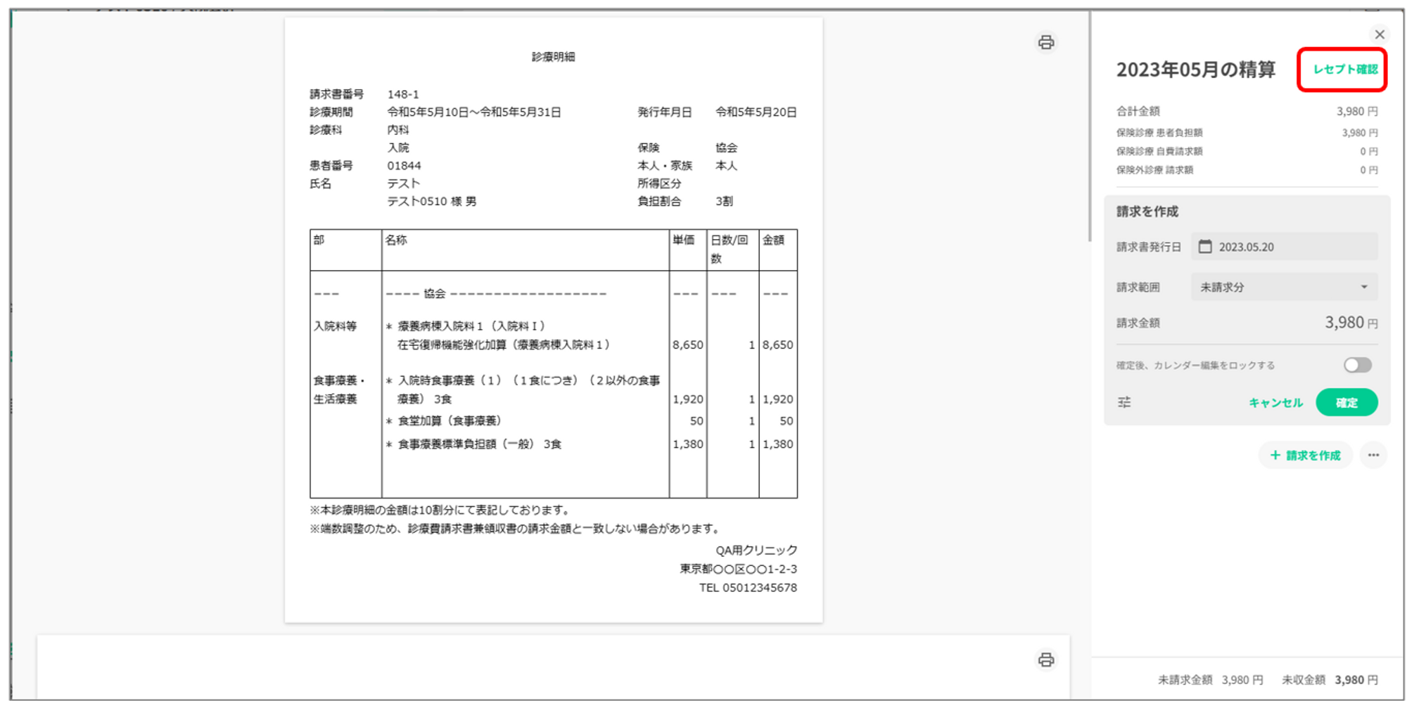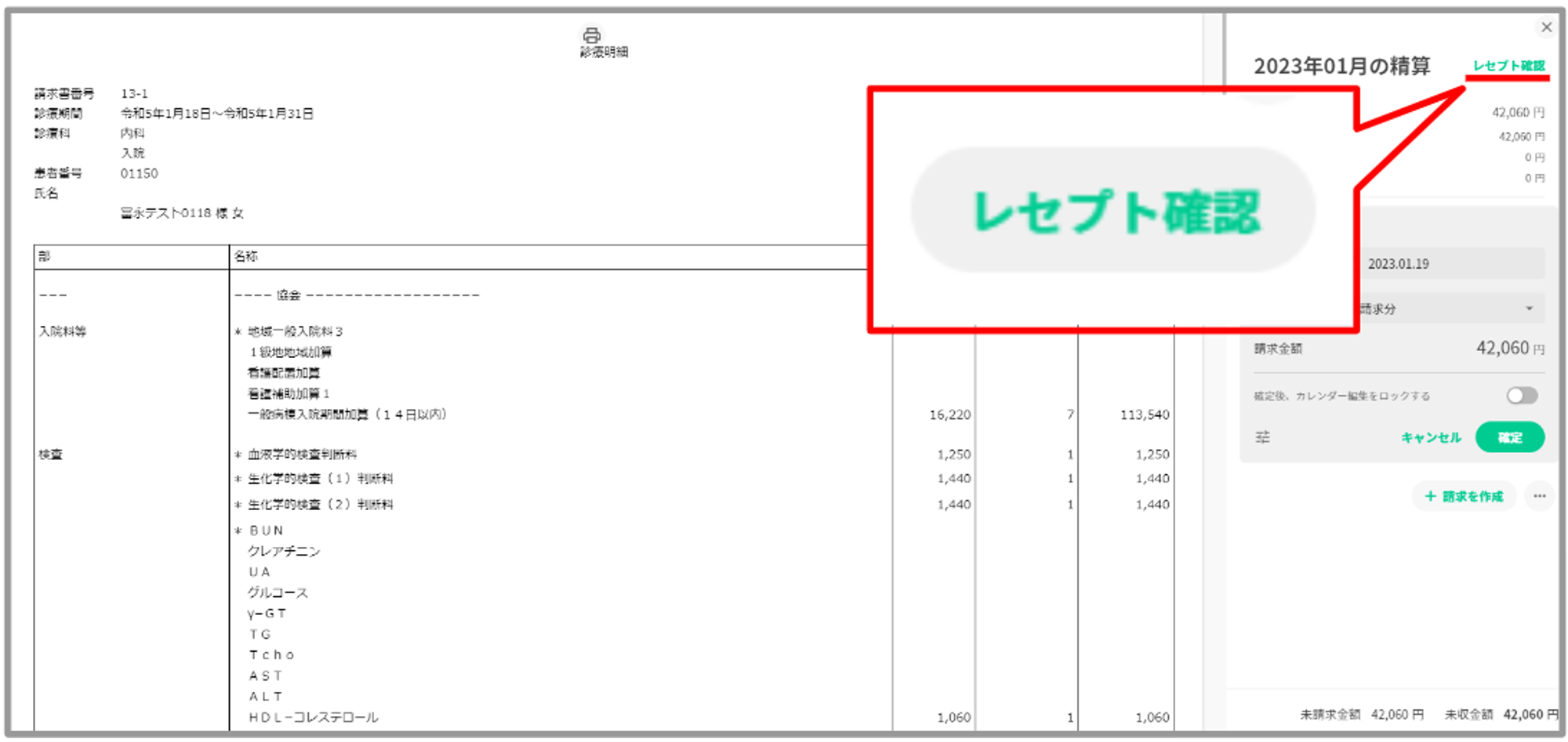 入院会計の請求精算画面の左上部に表示される「レセプト確認」ボタンを押下するとレセプトプレビューが立ち上がります。