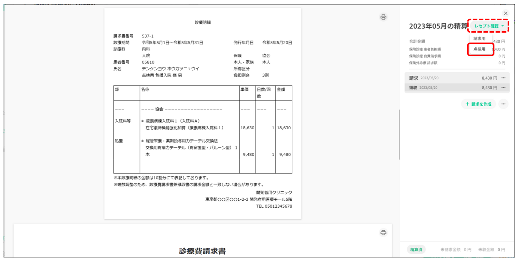 「点検用」ボタンを押下⇒包括項目も含まれた点検用のレセプトが表示されます