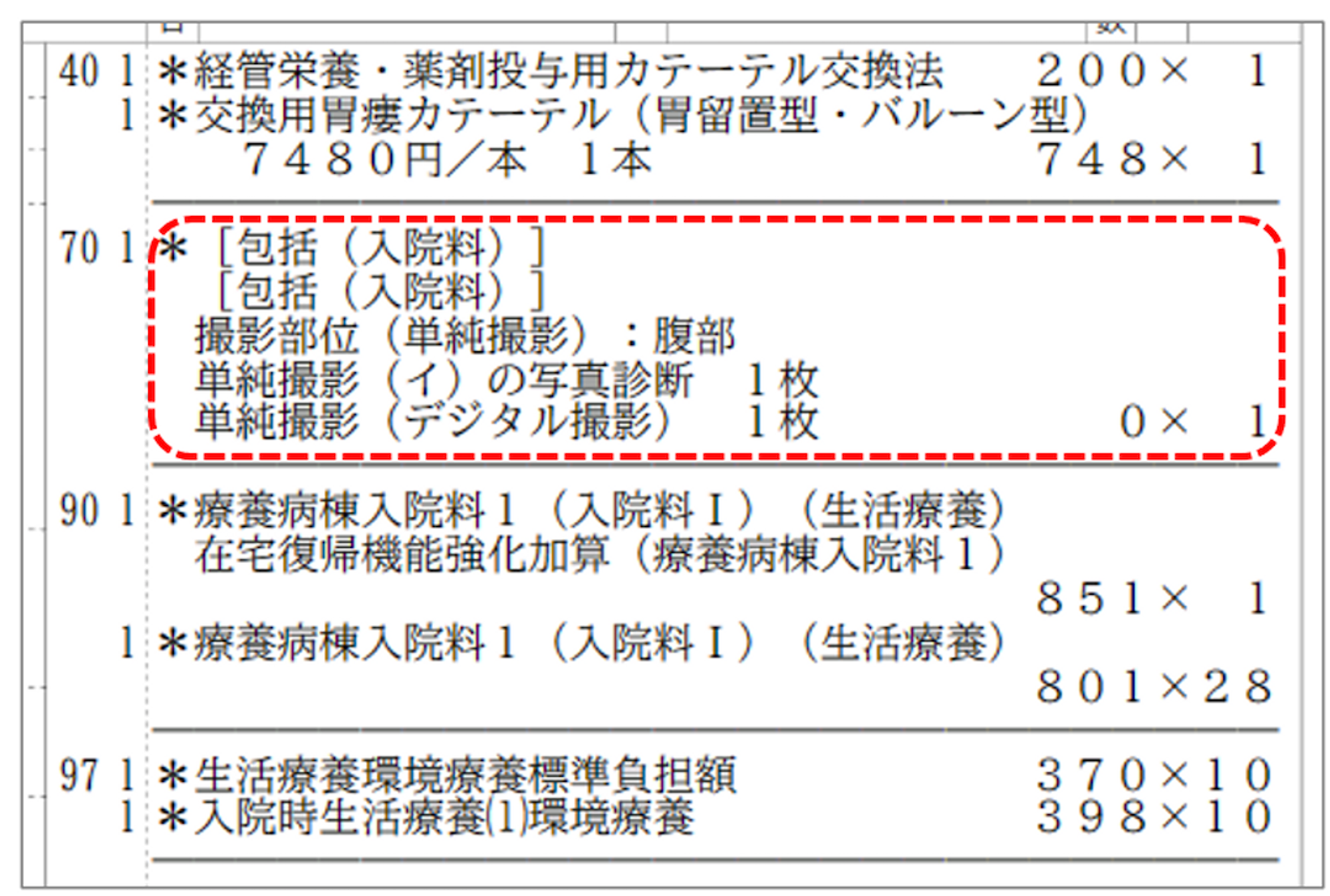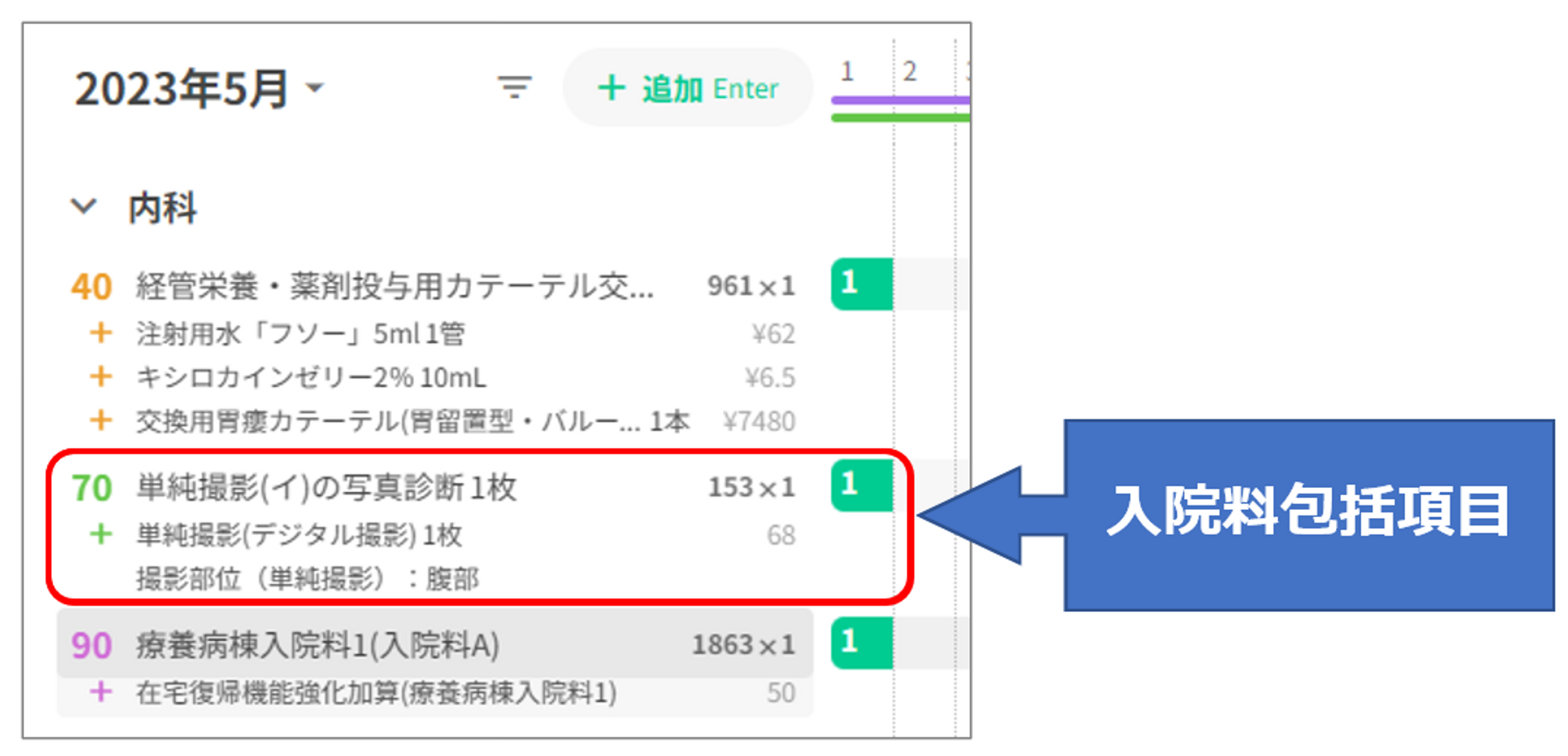 2.点検用のレセプトでは、入院料に包括される項目には [包括(入院料)] コメントが自動生成されます。