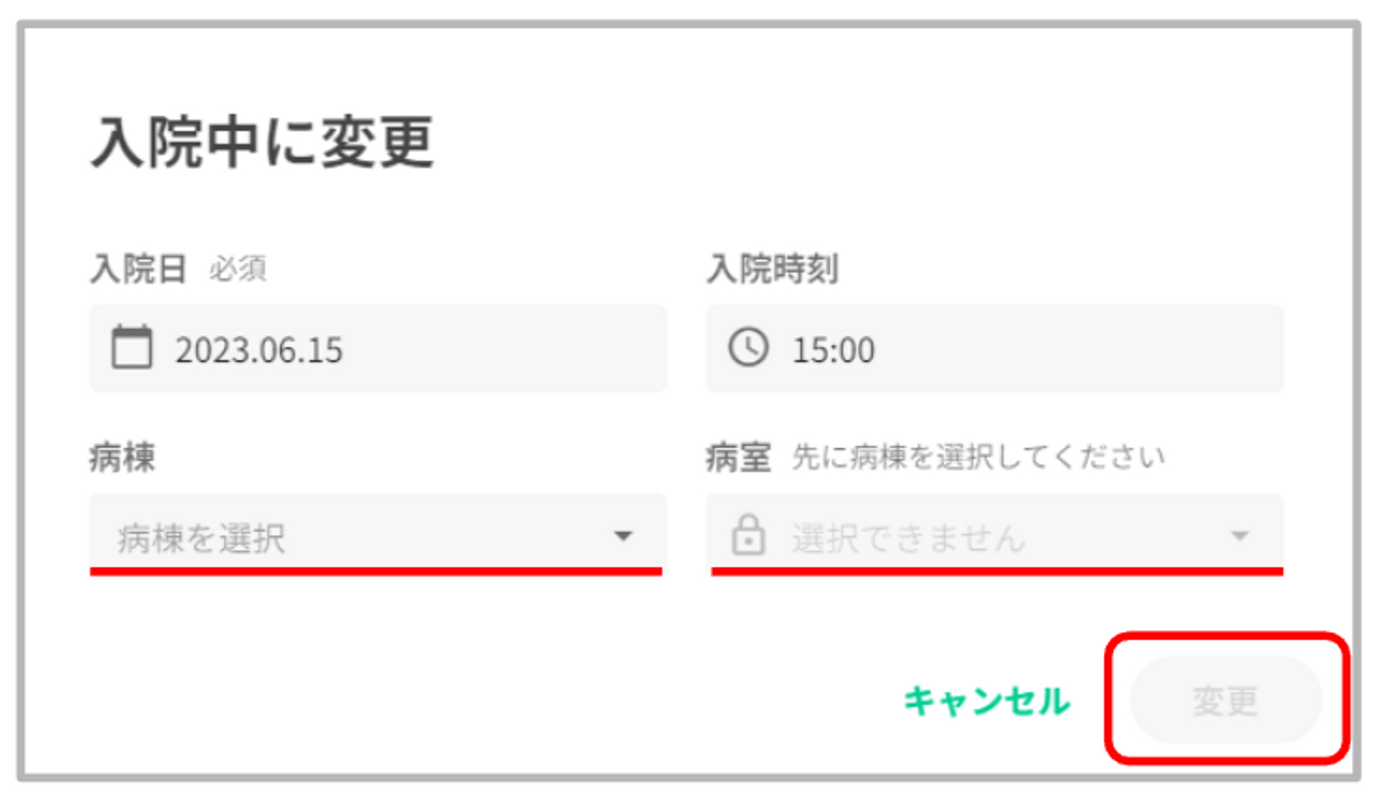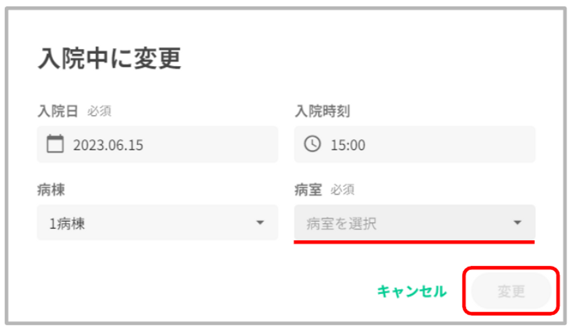 入院登録時の変更ボタンの表示改善入院予定の患者様を入院中に変更する際、病棟と病室の選択は必須項目となっています。病棟と病室の設定がない場合は、「変更」ボタンがグレー表示の無効状態となり、押下できません。病棟のみ設定されており、病室の入力がない場合も無効状態となります。