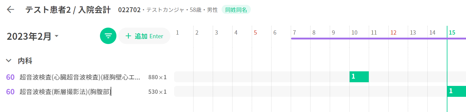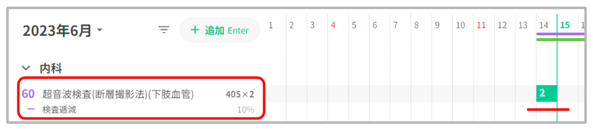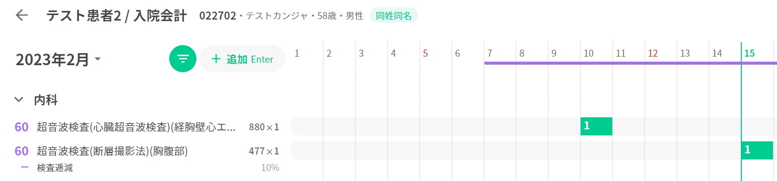 生体検査オーダーの際、同一検査を同一月内に2回以上実施した場合は、2回目以降はコストカレンダー(以下、コスカレ)上で検査逓減料が自動算定されます。