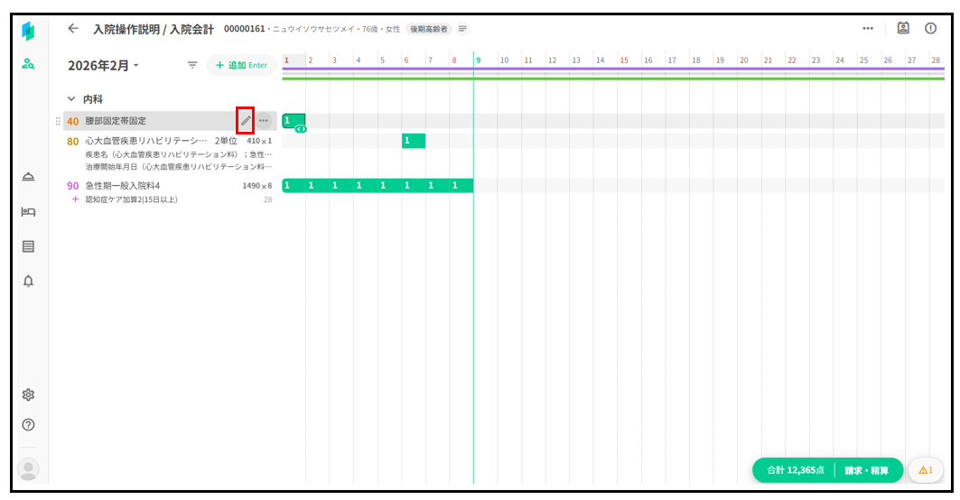 診療行為一覧で、変更したい診療行為の鉛筆マークをクリック
