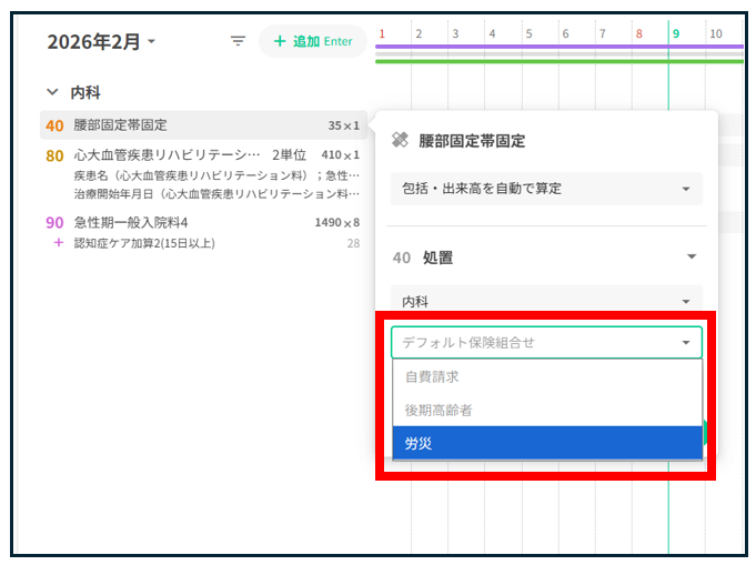 デフォルト保険以外で個別に保険を設定したい診療行為がある場合は、診療行為ごとに変更が可能です。