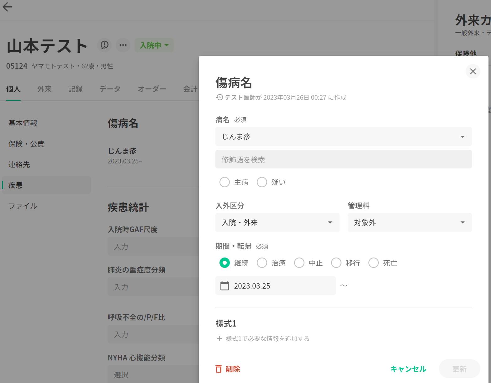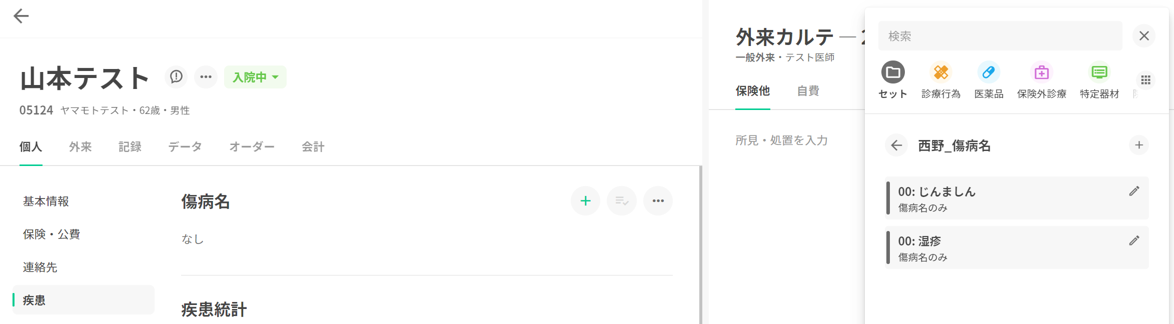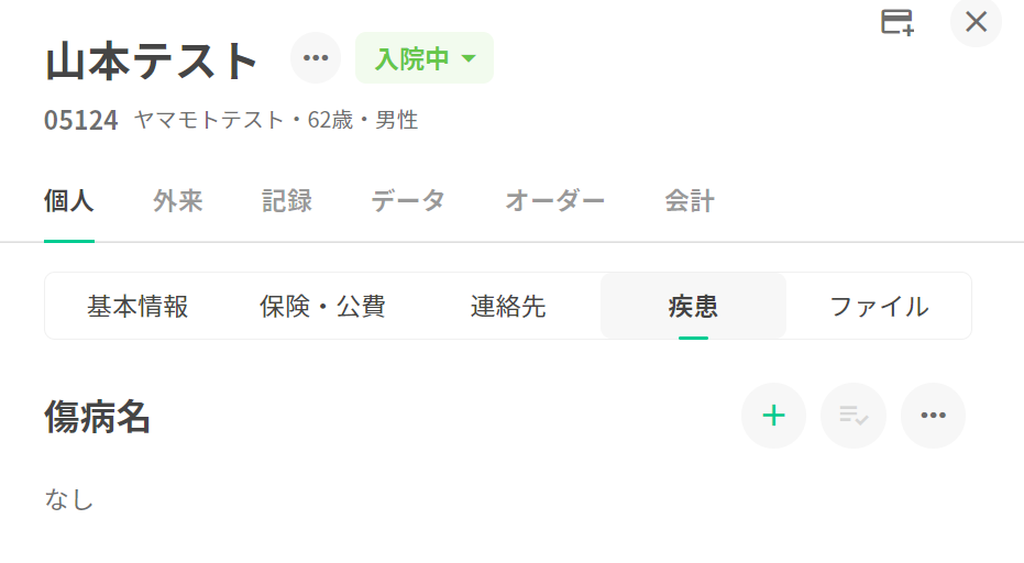 1.入院中の下記患者にセットで登録済みの傷病名を入力することに致します