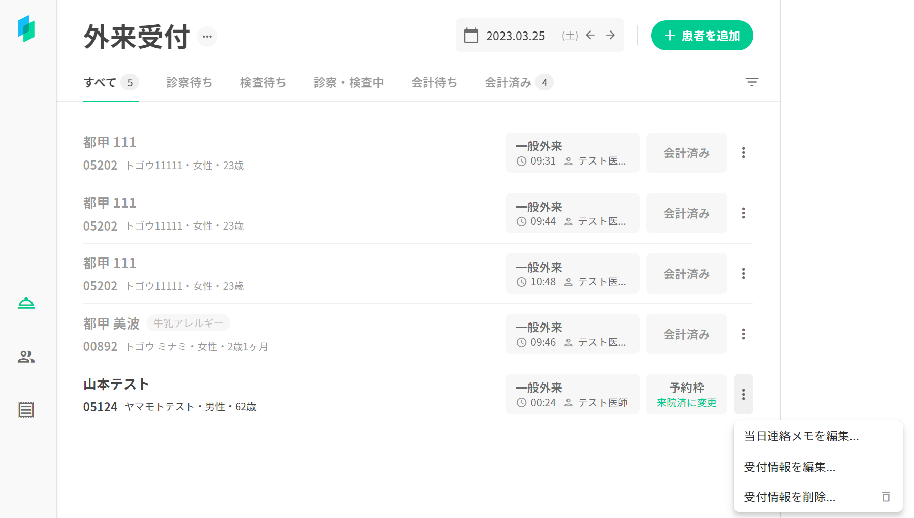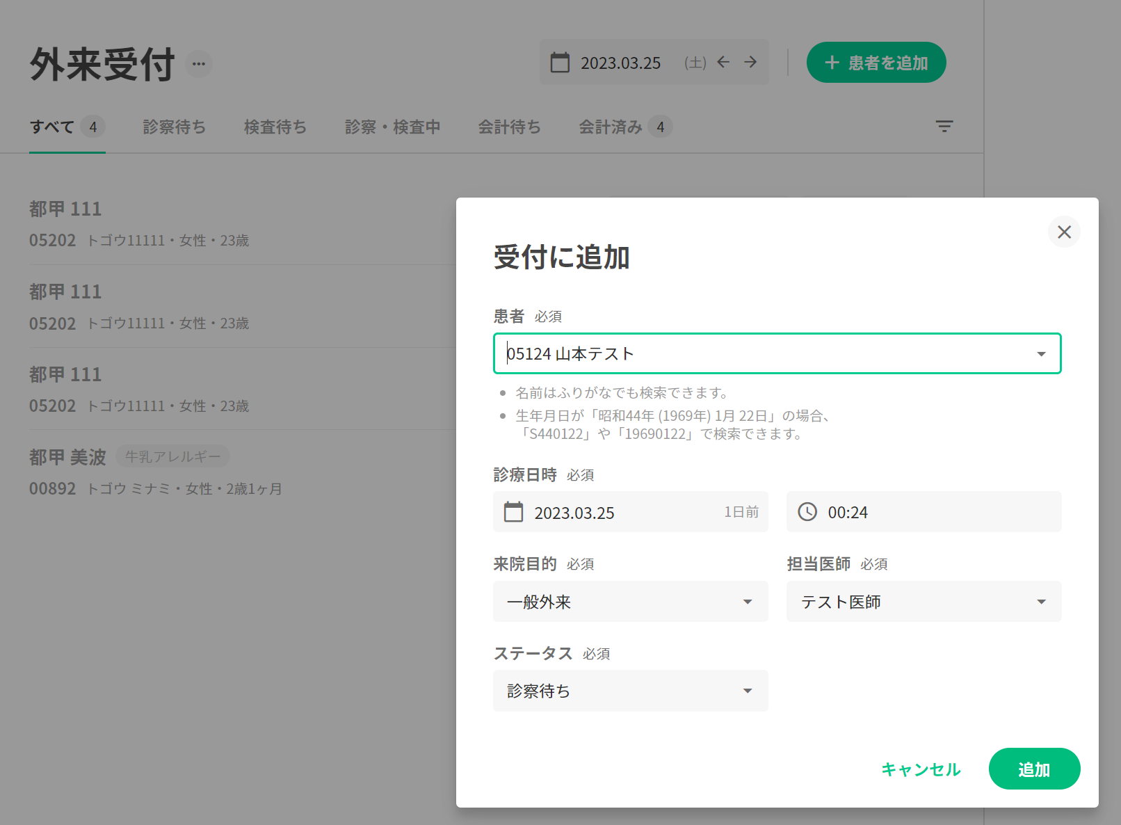 7.外来受付画面から当該患者の受付情報を削除します(当該入院患者に外来診察の予定は実際に無い事を想定している為)