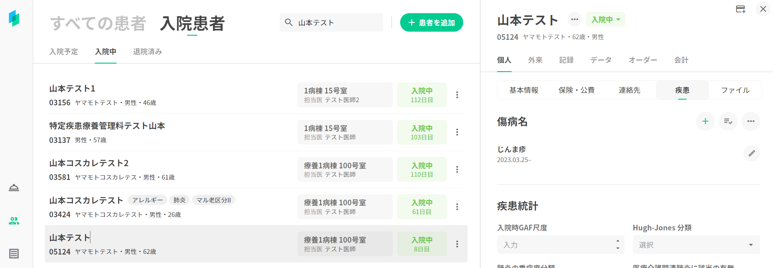 8.患者管理画面で当該入院患者を改めて検索すると無事傷病名が登録されたままになっています